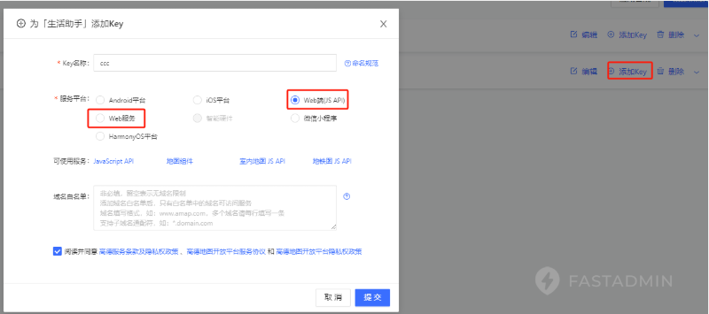 # 常见问题 项目按照需要配置多个插件和微信小程序,所以按照安装文档步骤安装,可能也会遇到一些细节问题,这里将可能经常遇到问题罗列出来供参考。 #### 重点 **除了文档里面推荐的插件,其他的不要安装,避免插件冲突** ##### 1.登录问题 登录需要配置,微信小程序后台 开发管理中的appid,secret看是否与项目后台->平台配置中的appid,secret是否相同, 同时在小程序后台中开发管理->开发设置,找到服务器域名中request合法域名,将项目域名填入。 ##### 2 地图,定位问题 需要配置3个地方,一个是要安装开发示例,需要用到地址数据表,一个是地图位置经纬度选择,这个地方高德地图创建应用服务平台是Web端(JS API),参考如图:   ##### 3 支付 如果多端需要将多个小程序appid在微信商户中绑定,因为项目中存在退款功能,需要设置微信支付证书,具体可参考官方文档 [https://pay.weixin.qq.com/wiki/doc/apiv3/open/pay/chapter2\_8\_1.shtml](https://www.fastadmin.net/outlink.html?url=https%3A%2F%2Fpay.weixin.qq.com%2Fwiki%2Fdoc%2Fapiv3%2Fopen%2Fpay%2Fchapter2_8_1.shtml) ##### 4 微信小程序推送 小程序模板推送需要在微信小程序后台模板消息里根据参考字段类型,设置相关模板,尽量不用修改字段类型,因为不同字段类型长度不同,会导致配置了也推送失败。 ##### 5 云存储 云存储有多种类型,如果具体流程设置流程不太明白,可以下工单咨询,如果前期使用图片存储到服务器,后面更换到云空间,需要将项目图片和后台附件图片都按照路径存入到云空间,如果前期可正常访问,后面没法访问,可查看是否cdn的ssl证书到期或者cdn流量包用完需要充值。 ##### 6 定时任务 定时任务要根据定时类型设置相关任务,看域名是否与项目域名相同。